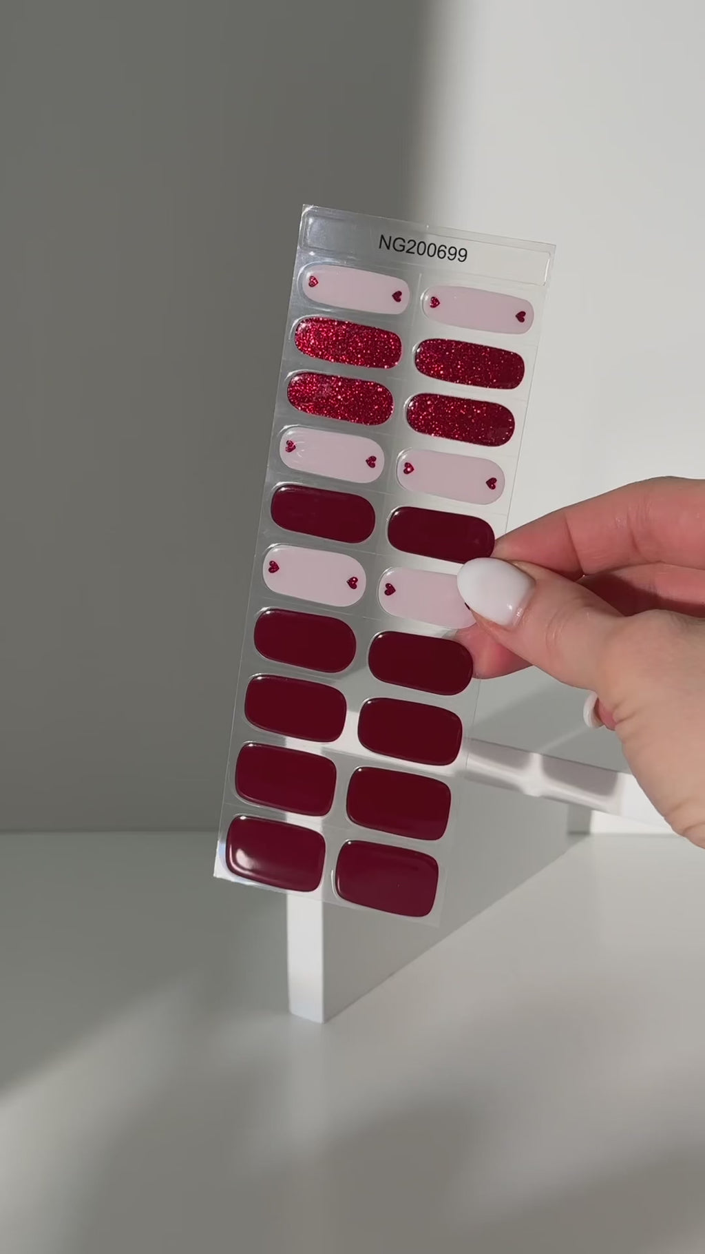 Rich, romantic tones accented by tiny heart details and finished with a dazzling red sparkly accent nail for the perfect touch of glamour.